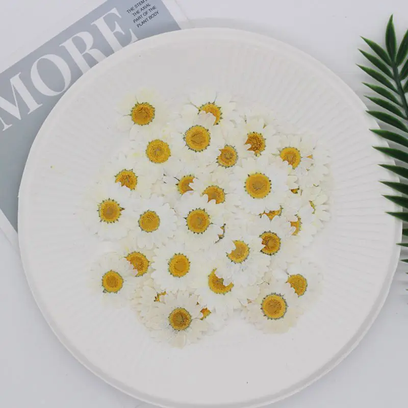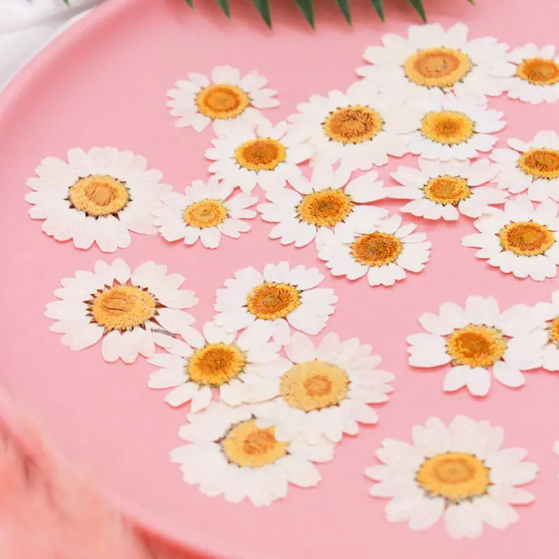 Marguerite blanche pressée séchée en lot de 100 pièces, idéale pour bijoux en résine, nail art, herbier et créations artisanales. De vraies fleurs naturelles pour des réalisations délicates et raffinées.
